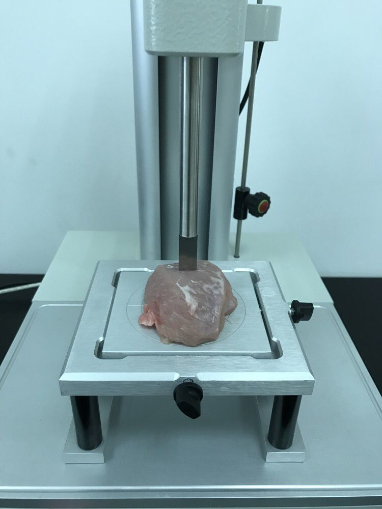P/BS剪切刀具被广泛用于评估家禽及大型禽类肉的嫩度,已成为国家农业标准NY/T 1180-2006的标准测试方法(点此下载)。刃口装置包括Warner Bratzler切刀和斜口、直角切刀,侧边可限制形变。通过测定仪器的传感器记录刀具切割肉样时的用力情况,并把测定的剪切力峰值(力的zui大值)作为肉的嫩度值。