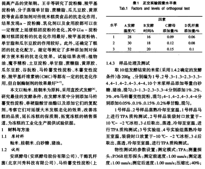 冻糕,传统特色糕点,min国年间怀远镇厨师蒋 仲渔所创。其制作工艺传统而*由大米经浸泡、磨浆、发酵并利用蒸汽汽蒸糊化成型,具有蟑窝状 结构,滋润绵软,富有弹性;松泡化渣,油而不腻,香甜微酸,有发酵产生的特殊风味的传统食品。它还 是我国中南和东南一带深受人们喜爱的特色食品, 具有鲜明的民族文化特色和地域性风味,同时也是 一种安全、健康的食品。然而冻糕的生产一直未能 引起研究者的足够重视,目前仍停留在手工生产阶 段,现产现销,并且不易储存,保质期短。因其生产 方式源于民间经验的积累,尚无科学理论的指导, 使得产品质量不稳定,难以满足日益增长的消费需 求。采用现代高新技术对我国传统食品加工业进 行改造、提升以及工业化,使之向着安全、营养、美 味、快捷、方便、多样化的方向发展是大势所趋。