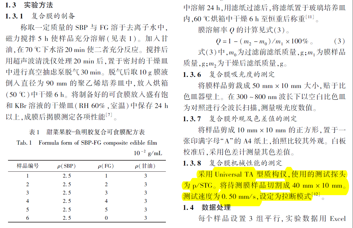 2019年,山东大学、北京工商大学、威海海洋职业学院联合在国内期刊《食品科学技术学报》在线发表了题为“甜菜果胶鱼明胶复合可食膜的制备及特性研究”的研究文章。在该文章中,研究人员使用Universal TA研究型质构仪测定复合膜的抗拉强度。