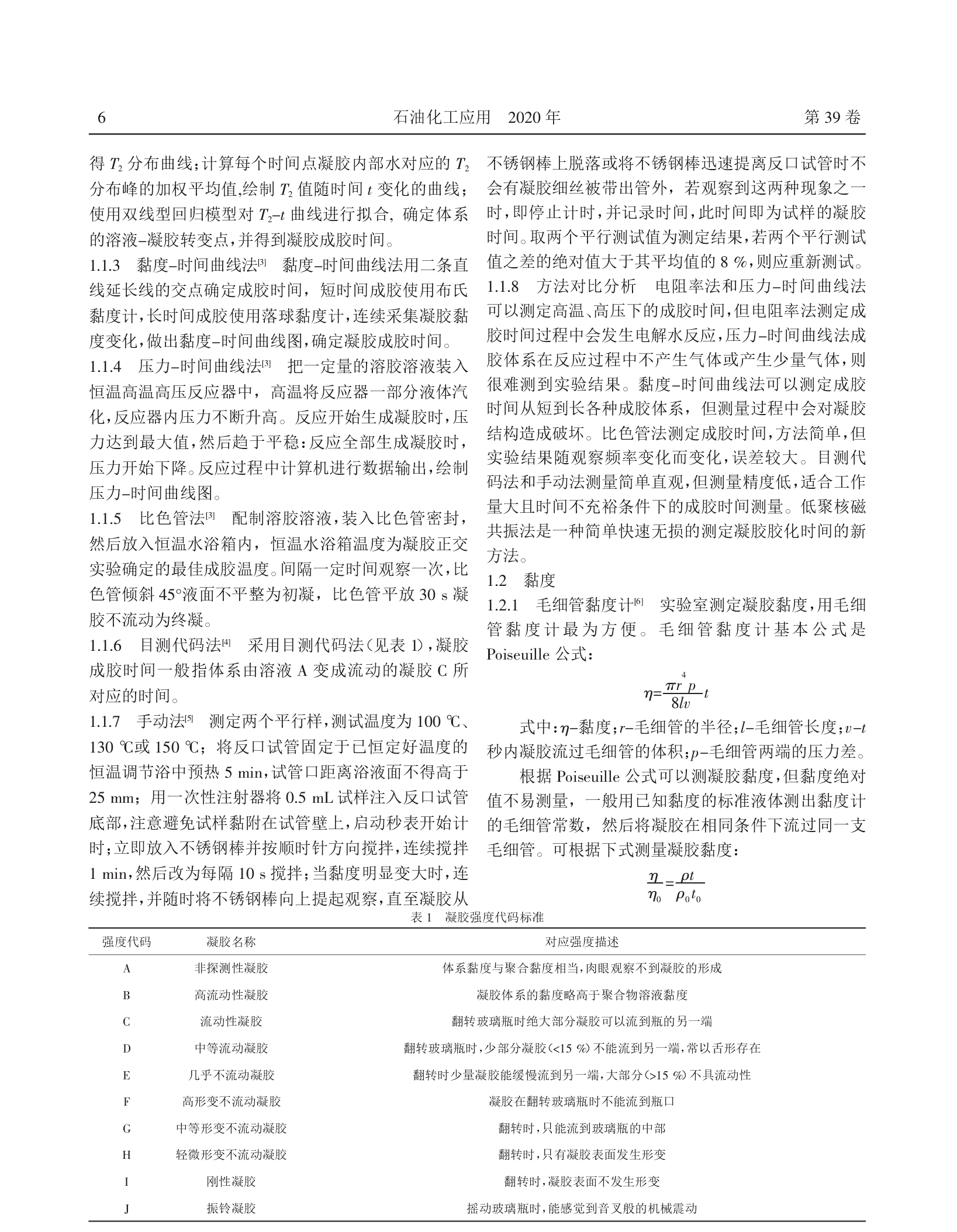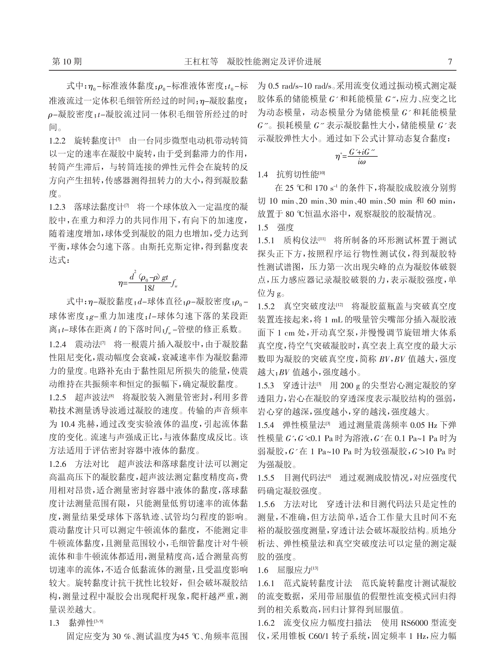 凝胶是线性聚合物在交联剂作用下,形成空间网状结构,结构空隙中充满了作为分散介质的液体,这种分散体系称作凝胶。凝胶是目前常用的封堵材料,一般凝胶性能从成胶时间、黏度、黏弹性、抗剪切性能、强度、屈服应力、蠕变回复性和封堵性能进行评价。关于凝胶性能测定一直没有统一的标准,本文总结对比了目前主要的凝胶性能测定方法。