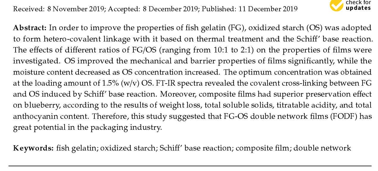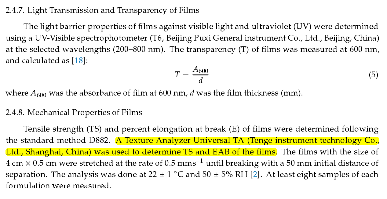 2019年12月,山东大学海洋学院研究人员在期刊《Polymers》在线发表了题为“Development and Properties of Fish Gelatin/Oxidized Starch Double Network Film Catalyzed by Thermal Treatment and Schiff’Base Reaction"的研究论文。在本论文中,研究人员利用上海腾拔Universal TA研究型质构仪用于测定鱼明胶/氧化淀粉膜的拉伸强度和断裂伸长率。