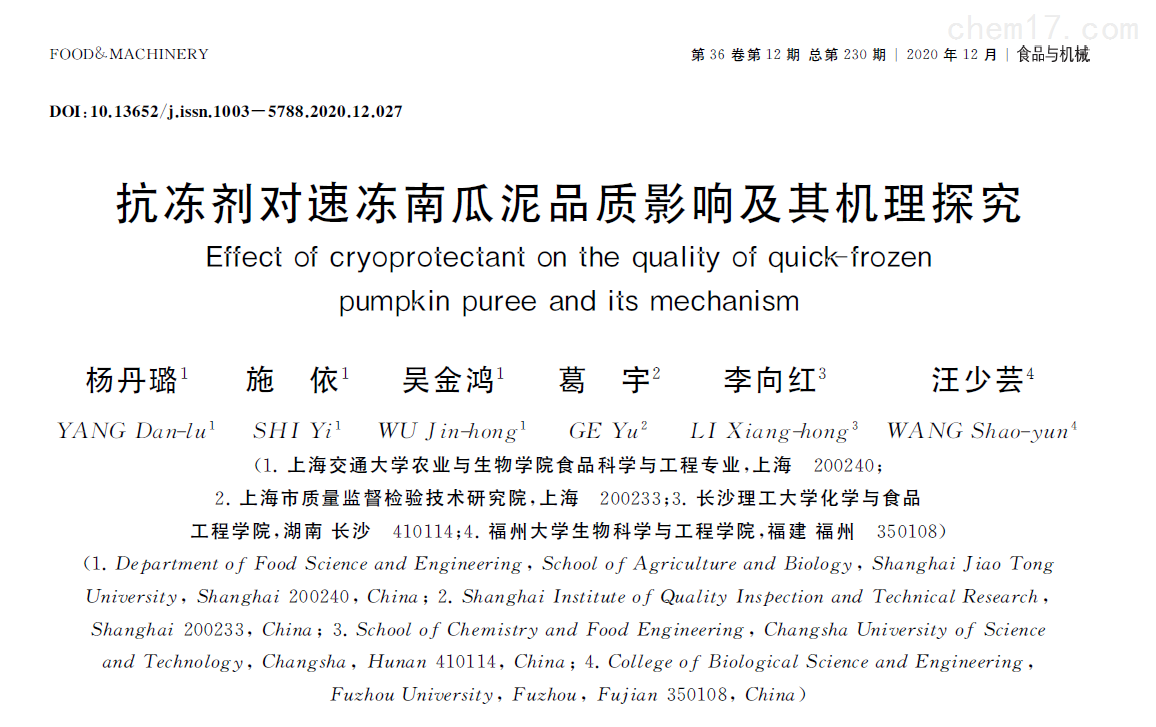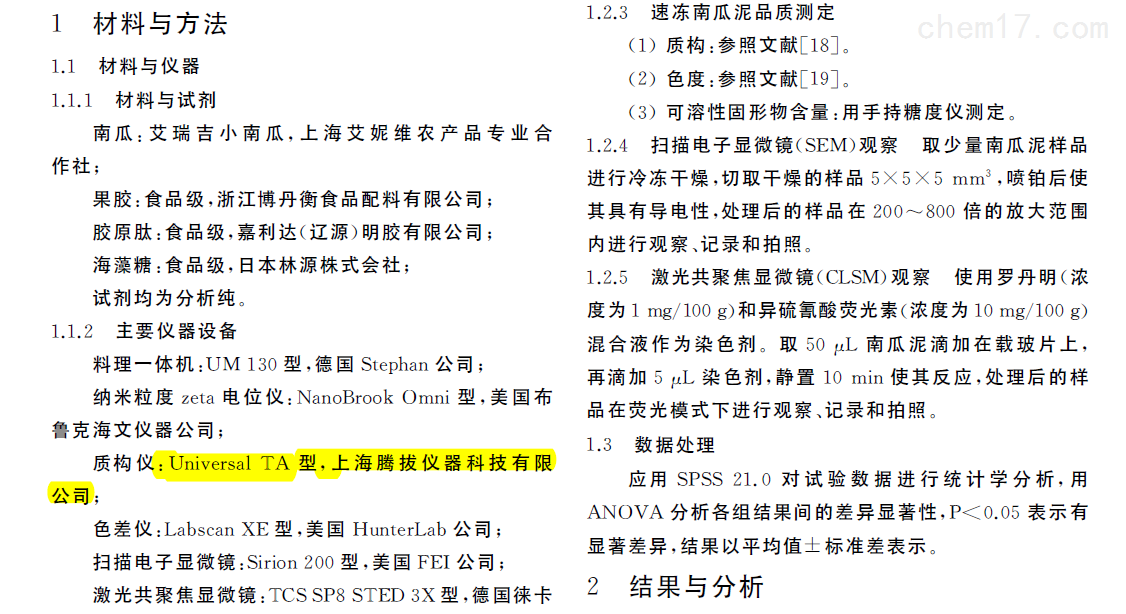 2020年,上海交通大学农业与生物学院研究人员等在国内期刊《食品与机械》发表了题为“抗冻剂对速冻南瓜泥品质影响及其机理探究"的研究论文。在该论文中,研究人员利用上海腾拔仪器科技有限公司的Universal TA质构仪来测定速冻南瓜泥的硬度和内聚性。