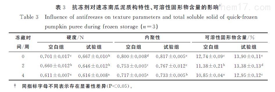摘要:为研究果胶、胶原肽及海藻糖组成的新型复配抗冻剂对速冻南瓜泥品质的影响并探究其机理,以析水率、粒径、Zeta电位值表征产品稳定性,采用质构特性、色度、可溶性固形物含量评价产品品质,并结合扫描电子显微镜与激光扫描共聚焦显微镜观察样品微观结构。结果显示,抗冻剂可显著减缓冻藏过程中速冻南瓜泥的析水率、平均粒径的升高趋势,以及L*、a*、b*、硬度、内聚性、可溶性固形物含量、Zeta电位绝对值的降低趋势,并且能够有效保护速冻南瓜泥的超微结构,使大分子分布均匀。