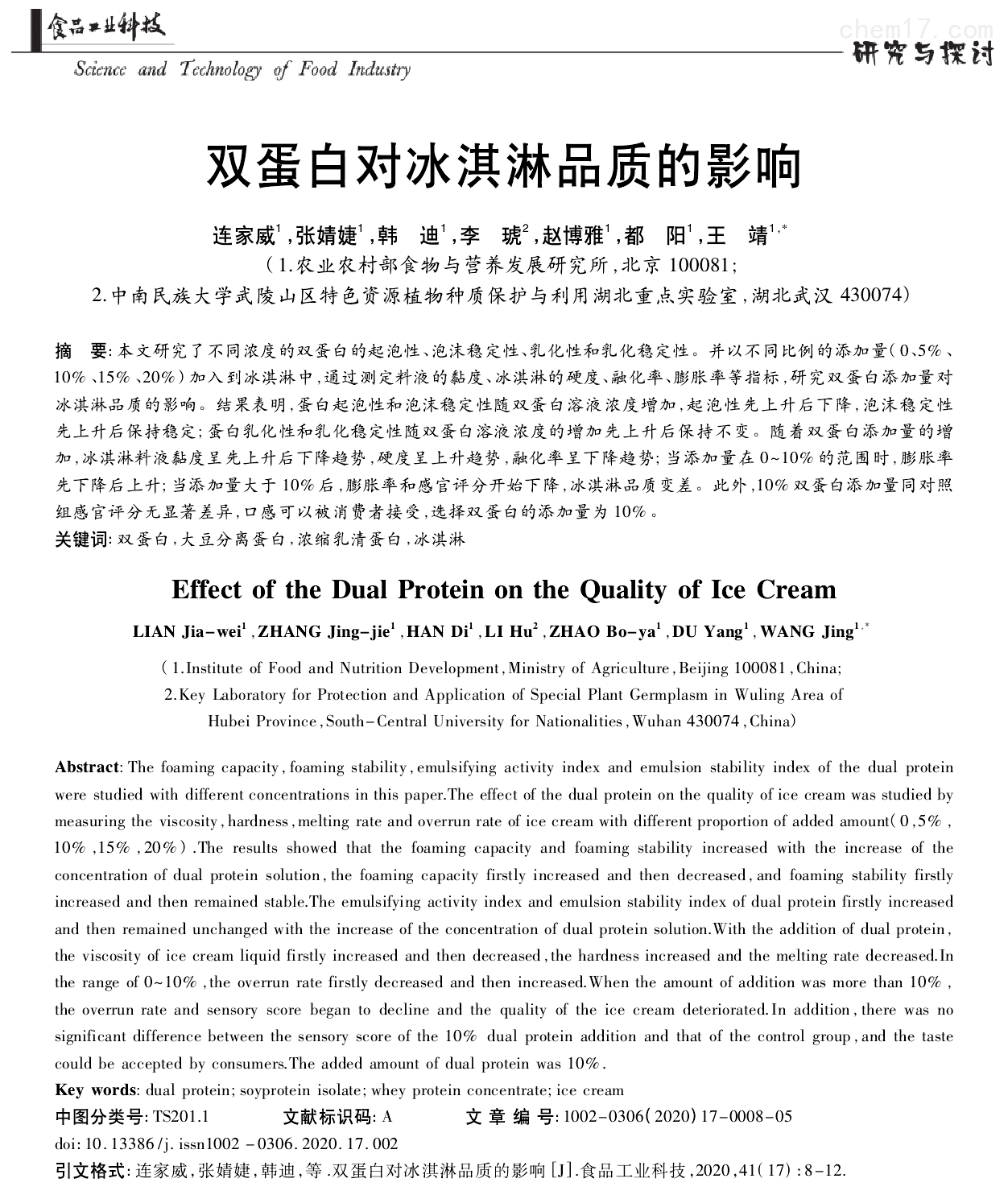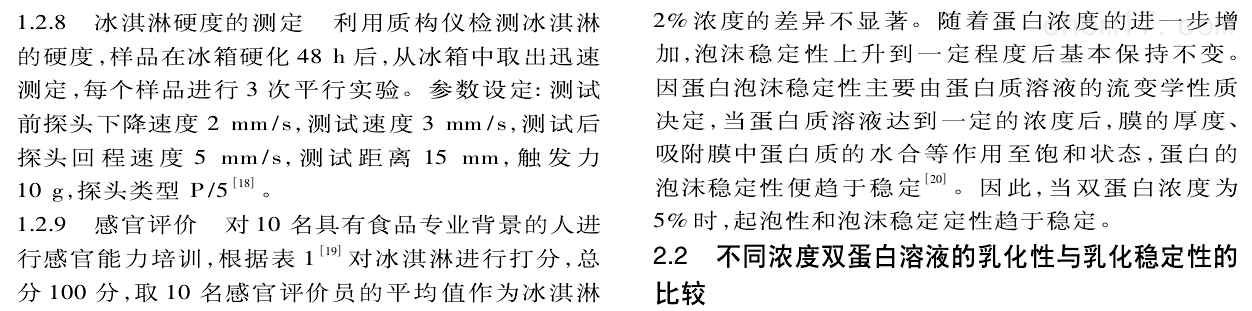 摘要: 本文研究了不同浓度的双蛋白的起泡性、泡沫稳定性、乳化性和乳化稳定性。并以不同比例的添加量( 0、5%、10%、15%、20%) 加入到冰淇淋中,通过测定料液的黏度、冰淇淋的硬度、融化率、膨胀率等指标,研究双蛋白添加量对冰淇淋品质的影响。结果表明,蛋白起泡性和泡沫稳定性随双蛋白溶液浓度增加,起泡性先上升后下降,泡沫稳定性先上升后保持稳定; 蛋白乳化性和乳化稳定性随双蛋白溶液浓度的增加先上升后保持不变。随着双蛋白添加量的增加,冰淇淋料液黏度呈先上升后下降趋势,硬度呈上升趋势,融化率呈下降趋势; 当添加量在0~10% 的范围时,膨胀*下降后上升; 当添加量大于10%后,膨胀率和感官评分开始下降,冰淇淋品质变差。此外,10%双蛋白添加量同对照组感官评分无显著差异,口感可以被消费者接受,选择双蛋白的添加量为10%。