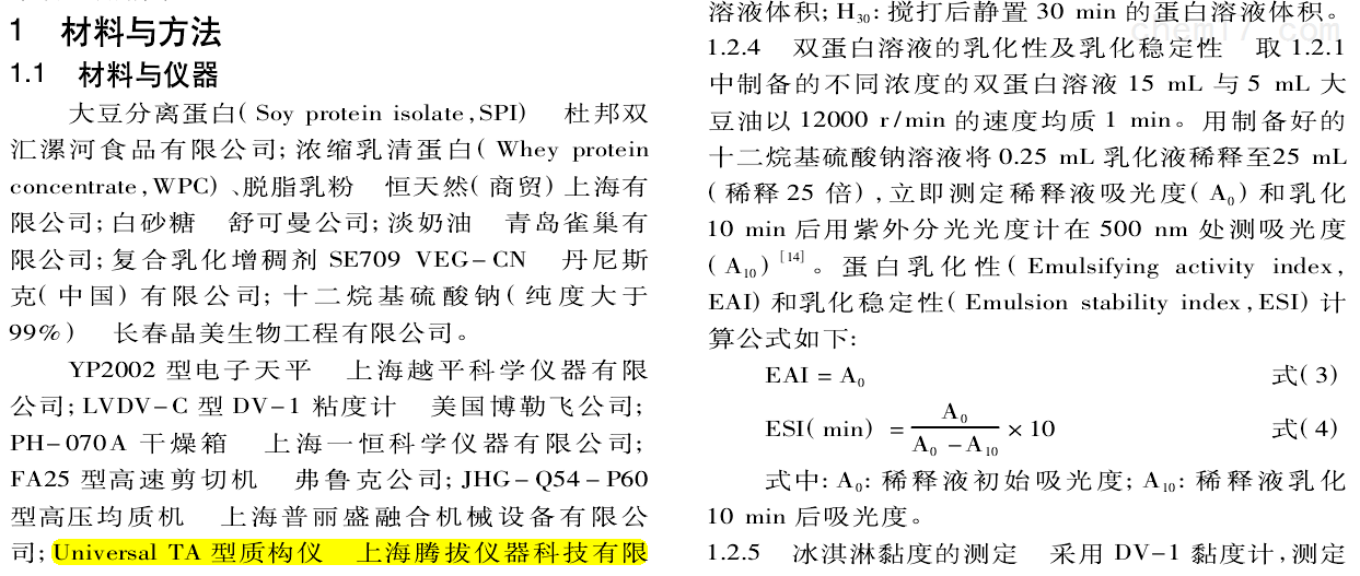 2020年,国内期刊《食品工业科技》刊登了农业农村部食物与营养发展研究所研究人员题为“双蛋白对冰淇淋品质的影响"的研究论文。在该论文中,研究人员利用上海腾拔Universal TA研究型质构仪来测定冰淇淋的硬度。