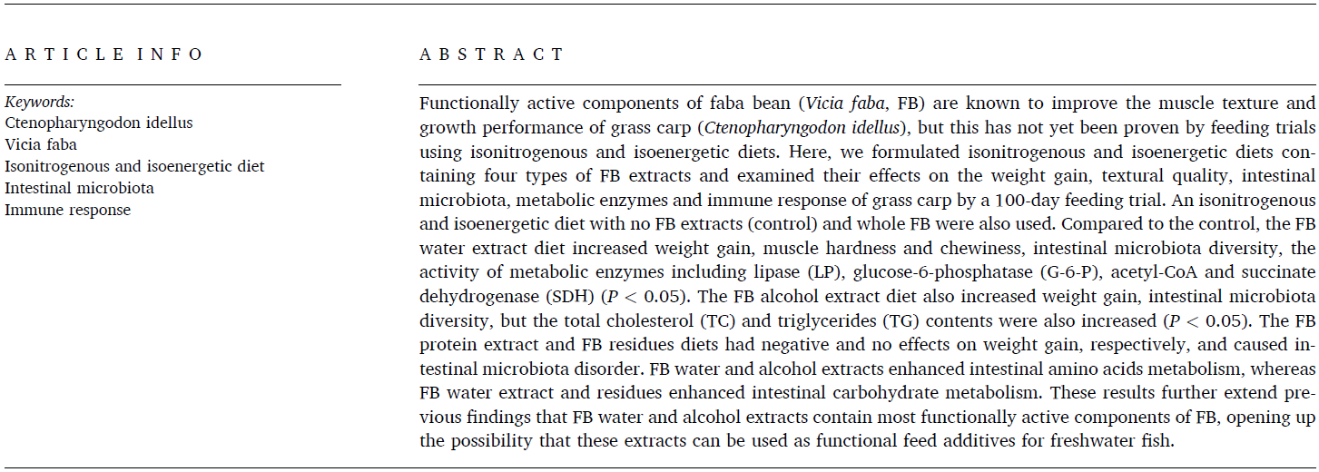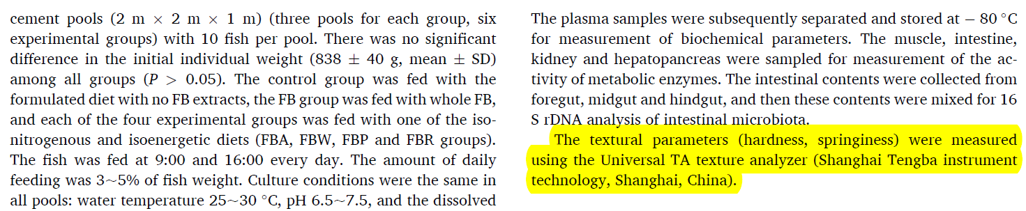 中国水产科学研究院珠江水产研究所研究人员在国际水产领域期刊《Aquaculture Reports》(IF=3.216)在线发表了题为“Growth performance, intestinal microbiota and immune response of grass carp fed isonitrogenous and isoenergetic diets containing faba bean extracts"的研究论文。在该论文中,研究人员利用上海腾拔Universal TA研究型质构仪测定草鱼的硬度、弹性等质构指标。