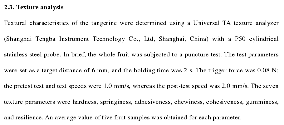 近日,桂林理工大学化学与生物工程学院研究人员在国际食品期刊《Journal of Food Processing and Preservation》(IF=2.190)发表了题为"Effects of 1-methylcyclopropene and abscisic acid treatments on texture properties and microstructures of postharvest tangerine (Citrus reticulata cv. Orah) "的研究论文。在该论文中,研究人员使用上海腾拔Universal TA研究型质构仪测定了柑橘的硬度、弹性、回复性、咀嚼性和内聚性等指标。