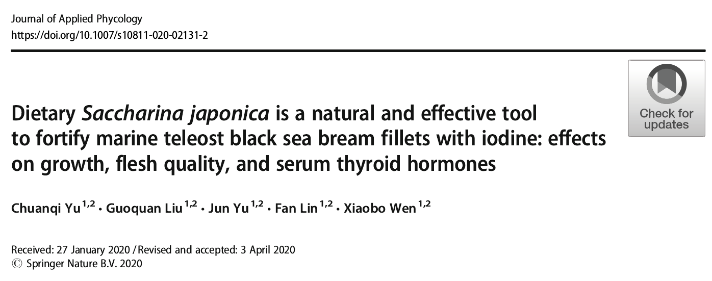 2020年4月3日,食品期刊《Journal of Applied Phycology》(IF=2.635)在线发表了汕头大学研究团队题为“Dietary Saccharina japonica is a natural and effective tool to fortify marine teleost black sea bream fillets with iodine: effects on growth, flesh quality, and serum thyroid hormones”的研究论文。