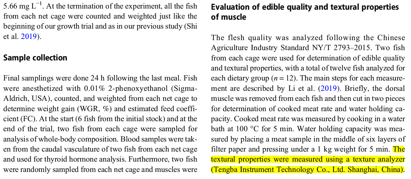 在该研究论文中,研究人员利用上海腾拔质构仪用于测定黑鲷幼鱼肌肉的硬度、弹性、回复性、内聚性和剪切力等指标。