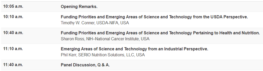Program officers from US funding agencies will discuss research priorities of their respective agencies related to fats and oils science and technology and upcoming opportunities for extramural funding. Emerging grand challenges in lipids from an industrial perspective, including areas that may bridge collaborative research between academia, government laboratories, and industrial sectors, will also be discussed.