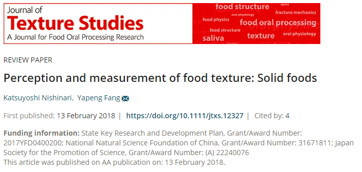 上海交通大学农业与生物学院方亚鹏教授2018年2月在《Journal of Texture Studies》在线发表了题为“Perception and measurement of food texture: Solid foods"的综述文章。